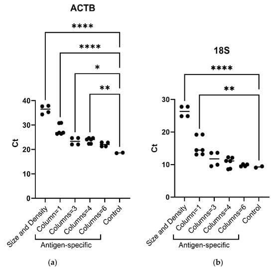 (a) ACTB (actinβ) mRNA and (b) 18S ribosomal RNA real-time PCR analysis (absolute Ct) according to reticulocyte sorting protocols (i.e., size/density and antigenic specificity, using one, three, four or six separation columns). Ordinary one-way ANOVA, multiple comparisons. One asterisk (*) indicates p value below 0.05 (p < 0.05); two asterisks (**) indicate p value below 0.01 (p < 0.01); four asterisks (****) indicate p value below 0.0001 (p < 0.0001)).