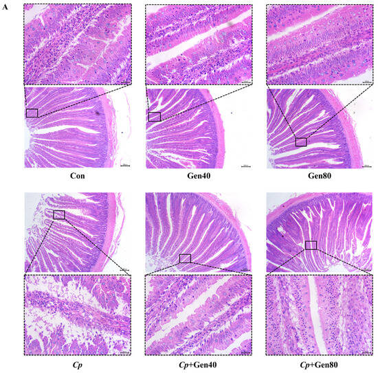 Cp-induced SNE caused severe intestinal erosion as evidenced by the separation of lamina propria and intestinal epithelium, necrosis, and exfoliation of numerous epithelial cells, which were alleviated by the addition of genistein (Figure 1A). Furthermore, the intestinal lesion scores were higher in the Cp group compared with the control group, which was alleviated by genistein supplementation (Figure 1B). Notably, only 40 mg/kg genistein supplementation significantly increased the duodenal villus height of broilers in comparison with the control group (Figure 1C). Additionally, Cp infection markedly reduced villus height and the ratio of villus height to crypt depth, whereas supplementation of genistein alleviated the negative impact of Cp on the villus height of the duodenum (Figure 1C).
