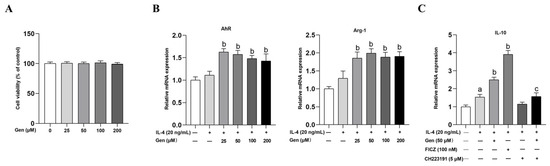 In an in vitro study, we investigated the influence of genistein on the polarization of M2 macrophages and its interrelation with AhR in RAW264.7 cells. Cell viability assay demonstrated that genistein at concentrations ranging from 25 to 200 μΜ did not affect cell viability (Figure 5A). Furthermore, we measured the mRNA levels of AhR and Arg-1 through qRT-PCR. We found that genistein at varying concentrations significantly increased the expression of AhR and Arg-1, with the most substantial effect observed at 50 μM in the presence of IL-4 stimulation in RAW264.7 cells, which was used for subsequent experiments (Figure 5B).
