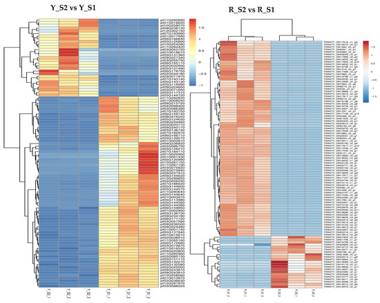 The cumulative anthocyanin contents of the fruits belonging to P. pubescens (Y) and P. alkekengi (R) at four distinct developmental phases (S1–S4) are detailed in Table 2. At the commencement of fruit development (S1), P. alkekengi (R) exhibited a higher anthocyanin content in comparison to P. pubescens (Y), and both fruits demonstrated a progressive increase in total content during their growth. Analysis revealed that the total anthocyanin contents in P. pubescens fruits varied from 11.03 to 32.75 nmol/g, with the highest point at the firm ripening stage (YS3) and full maturity stage (YS4), at 30.83 nmol/g and 32.75 nmol/g, respectively. In P. alkekengi fruits, the overall anthocyanin levels varied between 25.98 and 58.73 nmol/g throughout the four phases with the peak measurement seen at the complete ripening stage (RS4), hitting 58.73 nmol/g. Throughout the four developmental periods, the content of anthocyanins in P. alkekengi consistently exceeds that of P. pubescens. This elevated level of anthocyanins may account for the more intense red color observed in P. alkekengi fruits as compared to P. pubescens (Figure 1). Anthocyanins accumulated substantially within the fruits of P. pubescens and P. alkekengi during the firm and full ripening stages. As a crucial pigment constituent influencing fruit coloration, anthocyanins may play a significant role in the coloring process of the fruit during the later developmental phases.