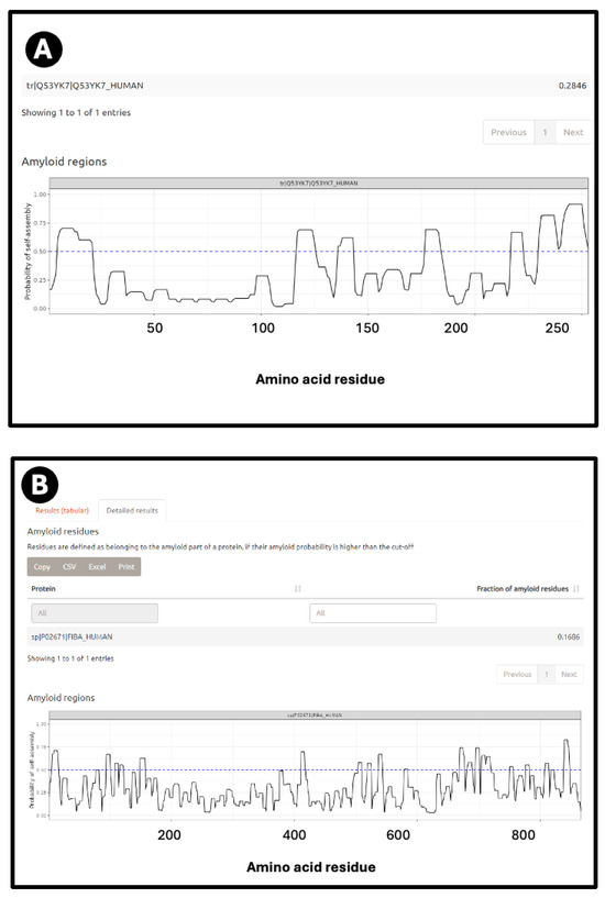 According to AmyPro [101], the most amyloidogenic region of fibrinogen α chain encompasses residues 148–160 (KRLEVDIDIKIRS), though Amylogram implies a second region nearer the C-terminus is even greater (Figure 2A).