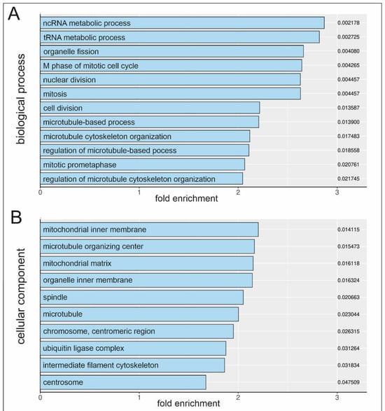 To clarify the molecular mechanism underlying human blood serum-mediated proliferation in hCSCs, RNA sequencing (RNA-Seq) was performed. We previously published a proliferative and senescence reducing effect of human blood serum and compared differential gene expression after induction with human blood serum from old and young donors, revealing the p38-MAPK signalling pathway to be crucial for serum-mediated proliferation in hCSCs [11]. Here, the application of human blood serum resulted in the significant upregulation of 213 differential expressed genes and downregulation of 31 genes which underline the inductive effect of human blood serum on gene expression in hCSCs (Figure 1). Interestingly, the TGFβ signalling target gene ATF3 [39] and the endogenous TGFβ inhibitor NR4A1 [40] were differentially expressed after serum-treatment. The here observed upregulation of both targets and inhibitors of the TGFβ pathway indicate a crucial role of TGFβ in regulating the serum-mediated effects on hCSCs at the molecular level. GO term analysis between untreated and serum-treated hCSCs likewise showed a significant enrichment of several biological processes (BP) which are strongly related to proliferation. These comprise terms like ‘M phase of mitotic cell cycle’, ‘nuclear division’, ‘mitosis’, ‘cell division’, ‘microtubule-based process’, ‘microtubule cytoskeleton organization’, ‘regulation of microtubule-based process’, ‘mitotic prometaphase’ and ‘regulation of microtubule cytoskeleton organization’ (Figure 2A). With respect to cellular components (CC), GO terms including ‘microtubule organizing center’, ‘organelle inner membrane’, ‘spindle’, ‘microtubule’, ’chromosome centromeric region’, ’intermediate filament cytoskeleton’ and ’centrosome’ were significantly enriched (Figure 2B). Accordingly, the molecular functions (MF) ‘microtubule binding’ and ‘tubulin binding’ were enriched (Figure 2C). The enriched GO terms revealed here with respect to BP, CC and MF emphasize the inductive effect of blood serum and strongly correlate with the reported proliferative effect of human blood serum on hCSCs.