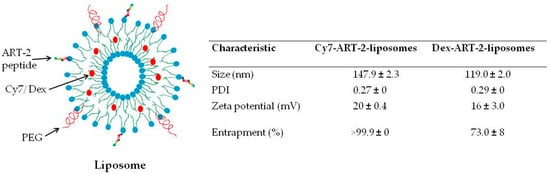 A schematic diagram of liposome composition and basic characteristics. Liposomes were prepared by thin-film hydration method. The surface of these liposomes displays a joint-homing peptide ART-2. These liposomes also have polyethylene glycol (PEG) on their surface to prevent their rapid clearance by the reticuloendothelial system. Furthermore, Cy7, a near infra-red dye, or Dex, a known anti-RA drug, is entrapped within the hydrophobic compartment of liposomes, which are referred to as Cy7-ART-2-liposomes or Dex-ART-2-liposomes, respectively. The basic characteristics of the liposomes shown include their size, polydispersity index (PDI), zeta potential, and entrapment efficiency (EE) of the cargo (dye/drug).