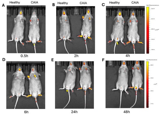 The time kinetics of in vivo biodistribution of Cy7-ART-2-liposomes in CAIA/control mice. Live images of arthritic mice vs. healthy (control) mice using IVIS (Xenogen, Alameda, CA, USA) at the indicated time points (0.5–48 h) (A–F) after i.v. injection of Cy7-ART-2-liposomes.
