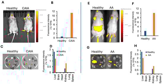 Live imaging of animals injected i.v. with Cy7-ART-2-liposomes showed a distinct pattern of tissue distribution in arthritic animals compared to healthy (control) animals (Figure 2 and Figure 3). In CAIA mice (Figure 2), the intensity of the fluorescence signal in both hind paws and fore paws showed a gradual increase post-injection, with optimal intensity at 4 h. The fluorescence intensity at each of the time points tested was much higher in the inflamed joints of arthritic mice than that of uninflamed joints of control mice. To examine the systemic tissue distribution of Cy7-ART-2-liposomes, we examined the organs harvested from mice at 4 h time point post-injection. No fluorescence signal was detectable from the brain, heart, lung, and spleen (Figure 3A–D). However, a low-level signal was observed in the case of the liver and kidney of both CAIA and control mice, suggesting that excretion of the dye through these two organs might account for the observed signal. For comparison and reference for CAIA, the results of a similar experiment performed in arthritic (AA) rats at the 4 h time point post-injection are also shown (Figure 3E–H). We previously reported that the 4 h time point had optimal fluorescence signal strength in arthritis joints of AA rats [], and this was confirmed again in CAIA mice (Figure 2 and Figure 3). Furthermore, the fluorescence signal in the liver and kidney of CAIA mice versus healthy mice, as well as AA rats versus healthy rats, was comparable, which in turn supports our proposition that these two organs serve as the excretion routes for Cy7. Thus, the overall tissue distribution of Cy7-ART-2-liposomes was comparable in the two models of RA tested.