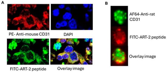 The frozen cryotome sections prepared from optimal cutting temperature (OCT) compound-embedded tissue were fixed with 4% paraformaldehyde. This was followed by washing and blocking of the non-specific binding sites and staining with fluorescence isothiocyanate (FITC)-labeled ART-2 peptide and phycoerythrin (PE)-labeled anti-CD31 antibody for 2 h at room temperature. At the final step, the tissue was layered with a mounting medium (Med Chem Express, Monmouth Junction, NJ, USA) containing 4′,6-Diamidino-2-phenylindole dihydrochloride (DAPI), which is a nuclear stain, and then covered with a cover slip and viewed under a microscope (Carl Zeiss Confocal Microscope LSM700, ZEISS, White Plains, NY, USA).