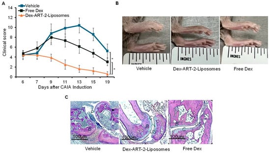 We have developed and validated a nanoparticle-based drug delivery method for arthritis therapy with the purpose of designing a platform technology that is both versatile and permits preferential targeting of arthritic joints, but not healthy joints or other organs of the body. The versatility of our technology lies in the potential of liposomes to entrap therapeutic agents of diverse types: hydrophobic or hydrophilic; small size or large size; and peptide/protein or oligonucleotides. In this study, we used liposomes entrapping Dex within them. However, our technology is not limited to liposomes. Other types of nanoparticles (e.g., micelles and polymeric nanoparticles) may also be considered for drug delivery [,]. We preferred liposomes because this category of nanoparticles is currently approved by the U.S. Food and Drug Administration (FDA) and other regulatory agencies globally for human use, for example, for cancer therapy []. In this context, liposomal formulation of the following drugs has been tested clinically in cancer patients and shown effectiveness: Doxorubicin for breast cancer, ovarian cancer, colon cancer, stomach cancer, and Kaposi’s sarcoma; Daunorubicin for AIDS-related Kaposi’s sarcoma; Cytarabine for central nervous system lymphoma and leukemia; Paclitaxel for non-small cell lung cancer; Irinotecan for pancreatic cancer; Vincristine for acute lymphoblastic leukemia; and Mifamurtide for high-grade non-metastatic osteosarcoma [,,,]. An additional application of liposomal therapy is to combine it with conventional clinical therapy, such as a combination of Caelyx and Doxil® (Baxter, Deerfield, USA) for colorectal cancer [,,,].