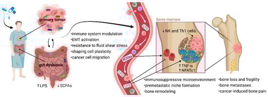 Proposed mechanisms linking dysbiotic gut and tumor microbiomes to bone metastasis. Anti-cancer therapies and pre-treatment with broad-spectrum antibiotics negatively affect the rigidity of the intestinal barrier, and changes in gut microbiome composition lead to a dysbalance between favorable bacteria and pathogens. Elevated gut permeability causes LPS translocation into circulation, which might promote cancer cell mobility. LPS or other bacterial metabolites interact with osteoclasts and osteoblasts, disrupting the balance between bone modeling and remodeling with accelerated metastasis building. The balance between osteoclast and osteoblast activity in bone is necessary for normal bone development. LPS support osteoclast function and activity in bone destruction via upregulated NFATc1 and TNF-α. Inappropriate osteoclast activity through bone degradation might prepare a favorable microenvironment (premetastatic niche) for early metastatic tumor cell colonization. Moreover, excessive osteoclast activity affects many pathophysiological processes in bones, leading to bone loss, fragility, fractures, and cancer-induced bone pain. An altered microbiome is associated with decreased production of favorable SCFAs, which play a role in osteoblastogenesis and bone health. Communication between the microbiome and bone metastases may occur through immune-mediated pathways. Considering the essential role of microbiome in immune system development, broad-spectrum antibiotics can affect the migration of NK and Th1 cells from the gut to the bone marrow. Reduced populations of Th1 and NK cells might support tumor growth within the bones. Typically, NK cells are developed in the bone marrow before migrating via the bloodstream to secondary lymphoid tissues, such as Peyer’s patches. Favorable microbiota interacts with NK cells, enhancing their activation and promoting cytolytic activity through the expression of granzyme B. Additionally, tumor-associated microbiota contributes to metastatic processes, including immune system modulation, EMT-related pathways, and matrix metalloproteinase regulation. Microorganisms residing in the TME can help cancer cells resist fluid shear stress by altering the actin cytoskeleton, which supports their survival in circulation and facilitates migration. Notably, a dysbiotic microbiome can modify the bone microenvironment, making it more conducive to cancer cell colonization. This allows tumor cells to adapt to the biochemical factors present in the premetastatic niche and subsequently initiate a metastatic cascade [,,]. Abbreviations: EMT, epithelial-to-mesenchymal transition; LPS, lipopolysaccharides; NFATc1, nuclear factor of activated T cells, cytoplasmic 1; NK cells, natural killer cells; SCFAs, short-chain fatty acids; Th1 cells, type 1 T helper cell; TNF-α, tumor necrosis factor-alpha; TME, tumor microenvironment.