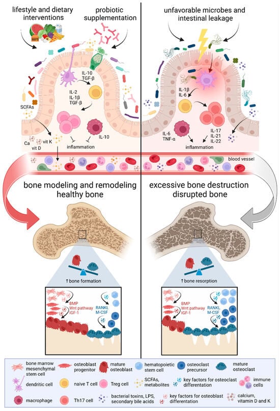 The impact of the gut microbiome on bone development. Gut microbiome composition regulates bone metabolism through the immune cascade along the microbiome-gut-bone axis. Studies focusing on the microbiome-bone crosstalk have shown that disruptions in the microbiome and the production of pro-inflammatory factors might promote bone resorption and lead to bone loss. However, microbiota modulation through lifestyle and dietary interventions, as well as probiotic supplementation, appears to support enhanced bone formation and increased bone mass. A healthy microbiome supports the processes of bone modeling and remodeling, maintaining the balance between bone resorption and formation. The production of microbiota-derived metabolites, such as SCFAs, prevents bone loss. Mounting evidence highlights the critical role of the gut microbiome in shaping the host’s immune system. An imbalance between Treg and Th17 immune cells has opposing effects on bone remodeling. Higher levels of Treg cells contribute to osteoblast differentiation and bone mass increase, whereas an increased amount of Th17 cells is associated with bone resorption and loss. Activation of key factors involved in osteoblastogenesis, including Wnt, BMP, and IGF-1, stimulates bone formation. Conversely, osteoclastogenesis is supported by essential factors such as RANKL and M-CSF [,,]. Abbreviations: BMP, bone morphogenetic protein; IGF-1, insulin-like growth factor 1; IL, interleukin; LPS, lipopolysaccharides; M-CSF, macrophage colony-stimulating factor; RANKL, receptor activator of nuclear factor kappa beta ligand; SCFAs, short-chain fatty acids; TGF-β, transforming growth factor-beta; Th17 cells, T helper 17 cells; TNF-α, tumor necrosis factor-alpha; Treg cells, regulatory T cells.