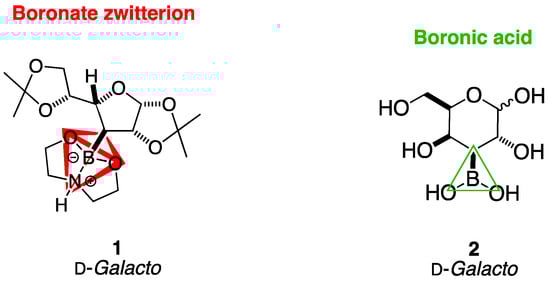 Structures of borylated intermediate 1 and borylated target molecule 2, both possessing d-galacto absolute stereochemical configuration. Highlighted in red in 1, the geometry of the B atom is tetrahedral, forming a zwitterion with the DEA. Highlighted via the green triangle in 2 is the B atom trigonal planar geometry.