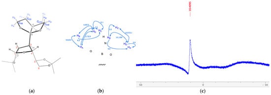 (a) Three-dimensional representation of zwitterion 1, showing the numbering of the H and C atoms of the DEA group. (b) Highlighted in bold are the bonds of the THF ring, the C-B bond, and the DEA group (right). J couplings (Hz) were identified among the DEA H atoms. (c) 11B-NMR (128 MHz, CD3OD) of 3-deoxy-3-boronodiethanolamine-1,2:5,6-di-O-isopropylidene-α-d-galactofuranose 1 with labelled signal.