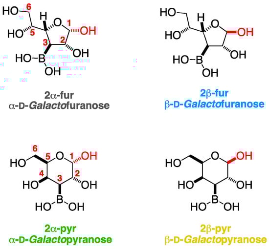 This paragraph deals with the intramolecular and intermolecular B-O interactions, alongside the process of borarotation to equilibrium composition. The mutarotation equilibrium composition of the reference compound d-galactose in water is 30% α-pyranose, 64% β-pyranose, 2.5% α-furanose, 3.5% β-furanose, and 0.02% open-chain [,]. The target compound 2 was hypothesised to also prefer the pyranose anomeric conformations. In target compound 2, two signals were observed at 31.7 ppm and 19.4 ppm (Table 1). The signal at 31.7 ppm corresponded to the trigonal planar boronic acid, while the signal at 19.4 ppm was hypothesised to have arisen from an interaction between the B atom and one of the nearby OH groups (Scheme S2), giving a tetrahedral boronate anion species such as 2B, or as a result of complexation with a water molecule to give structures 3 and 4. Such intramolecular interactions when the target compound 2 is in the furanose form do not seem possible for the d-galactose absolute stereochemical configuration, but may be possible for other monosaccharide configurations (Scheme S2, indigo box). Similar intramolecular interactions have been observed between B and O atoms, where the oxygen belongs to an ether (11B-NMR chemical shifts at 40 ppm) [] or a carbonyl (11B-NMR chemical shifts at 16–14 ppm) [,].