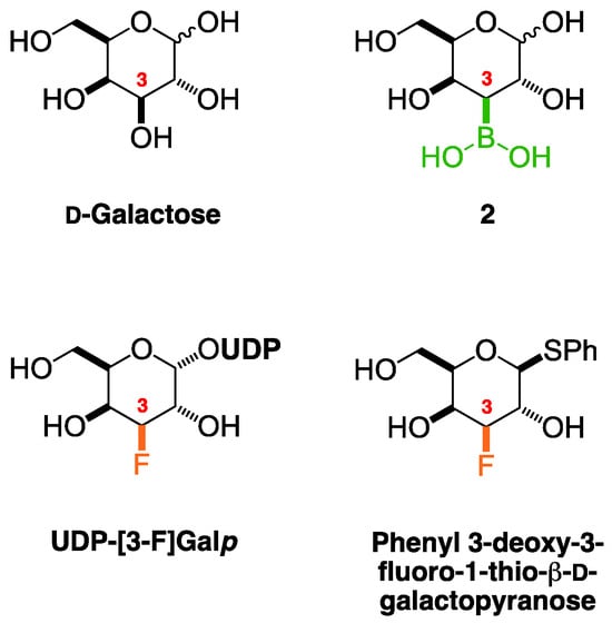 Structures of the target compound 2 and d-galactose in the pyranose forms, as well as of the UDP-[3-F]Galp and phenyl 3-deoxy-3-fluoro-1-thio-β-d-galactopyranose for NMR data comparison.