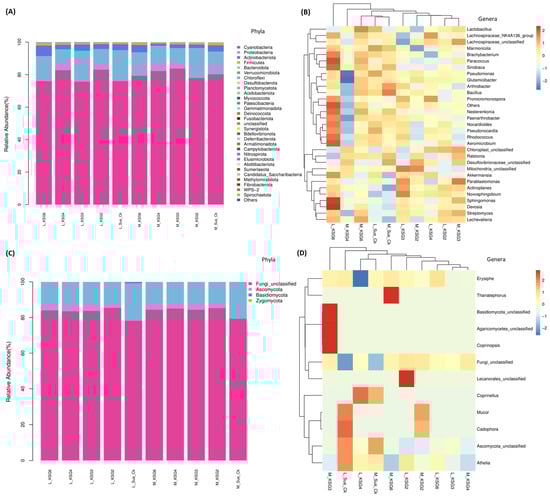Sugar beet genotypes relatively resistant to post-harvest storage diseases showed differences in the abundance of bacterial and fungal phyla and genera compared to the susceptible genotype. Mean relative abundance of (A) bacterial phyla; (B) bacterial genera; (C) fungal phyla; and (D) fungal genera in sugar beet roots at mid and late post-harvest storage stages. Susceptible genotype: Sus_Ck; resistant genotypes: KSG2, KSG3, KSG4, and KSG6; M: mid time point; L: late time point. The data are mean ± standard error of 4 biological replicates, each replicate consists of tissues harvested from 2 sugar beet roots. The heat maps (B,D) are plotted using z-score values of the species abundance. ‘0’ means the abundance is at the mean value. Red color means the species abundance is higher than the mean, and blue color means that the species abundance is lower than the mean. Blue to red transition means abundance of the species is transitioning from ‘lower than mean’ to ‘higher than mean’.