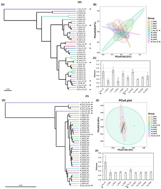 Beta diversity of bacteria and fungi in the resistant (R: KSG2, 3, 4, and 6) and susceptible (S: Sus_Ck) sugar beet genotypes at mid (M) and late (L) storage time points. (A) Cluster dendrogram of bacterial diversity; (B) principal coordinate analysis (PCoA) of bacterial diversity; (C) comparison of weighted UniFrac distances between S and R genotypes (16S); (D) cluster dendrogram of fungal diversity; (E) principal coordinate analysis (PCoA) of fungal diversity; and (F) comparison of weighted UniFrac distances between S and R genotypes (ITS). The data are mean ± standard error of 4 replicates (each replicate consists of 2 sugar beet roots); * p < 0.05. Solid dark circle next to the treatment represents the susceptible genotype.