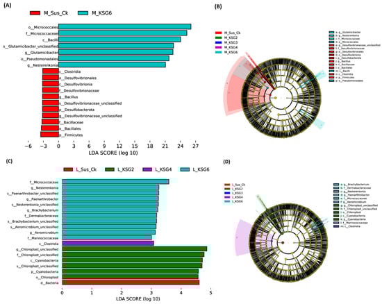 Linear discriminant analysis Effect Size (LEfSe) was used to identify any potential biomarkers associated with the R lines used in this study. At the M time point, the LEfSe comparison between Sus_Ck and the R lines showed a putative bacterial marker only in the KSG6 line. Examples of bacterial taxa associated with KSG6 (Figure 3A,B), with high LDA scores (between 22–27), included Micrococcales, Micrococcaceae, Bacilli, Glutamicibacter, etc. At the L time point (Figure 3C,D), Cyanobacteria were predominant in KSG2, Clostridia in KSG4, and Micrococcaceae, Nesterenkonia, and Paenarthrobacter in KSG6. No fungal biomarkers associated with the R and S genotypes used in this study could be resolved using LefSe analysis when compared at the M and L time points.