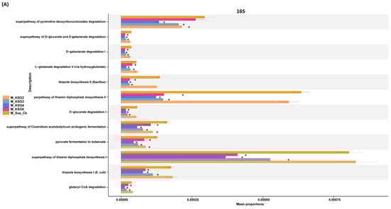 At the M storage time point, the majority of the detected bacterial microbiome-associated KEGG pathways were primarily down-regulated (p < 0.05) in the R lines, except for KSG2. A few examples of KEGG pathways that were highly down-regulated in the R lines at the M time point include the super pathways of pyrimidine deoxyribonucleoside degradation, the super pathway of thiamin diphosphate biosynthesis I, the super pathway of thiamin diphosphate biosynthesis II, etc. (Figure 4A). At the L time point, pathways that were primarily up-regulated in the R lines included purine nucleobase degradation I (anaerobic) and the super pathway of L-tryptophan biosynthesis (Figure 4B).