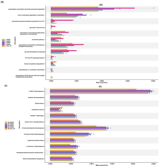 KEGG modules were significantly different (p < 0.05 *) between the resistant and susceptible sugar beet genotypes. (A) Mid (M) storage time point (bacteria; 16S); (B) late (L) storage time point (bacteria; 16S); and (C) mid (M) storage time point (fungi; ITS). Data are mean ± standard error of 4 replicates (each replicate consists of samples obtained from two roots). Sus_Ck: susceptible genotype; KSG2, KSG3, KSG4, and KSG6: resistant genotypes.