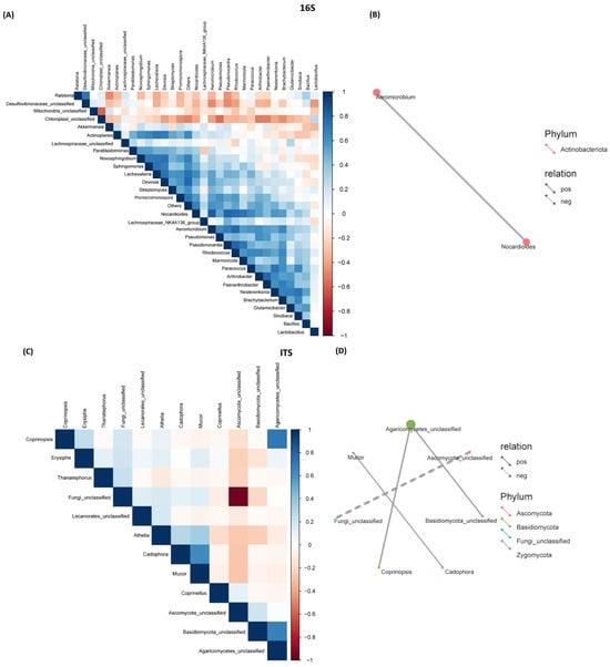 Sparse Correlations for Compositional data (SparCC). (A) Correlation heatmap between bacterial communities; (B) correlation network between bacterial communities; (C) correlation heatmap between fungal communities; and (D) correlation network between fungal communities. A solid line between two bacterial/fungal communities indicates a positive correlation and a dotted line indicates a negative correlation between them. The thicker the solid line, the higher the value of the positive correlation between them.