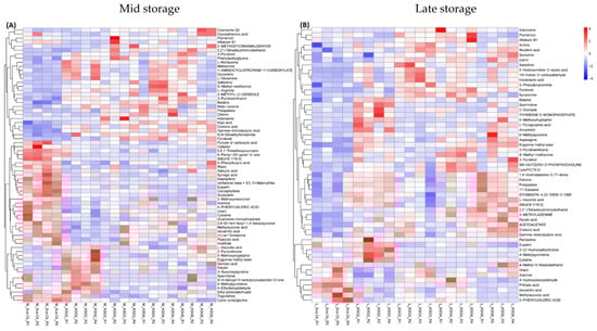 Untargeted metabolome analysis of sugar beet roots showed distinct differences between the resistant (R) and susceptible (S) lines at mid and late storage time points. Metabolites showing major differences between the R vs. S lines at the (A) mid storage stage and (B) late storage stage. Sus.Ck: susceptible genotype; KSG2, KSG3, KSG4, and KSG6: relatively resistant genotypes; M: mid and L: late storage time points.