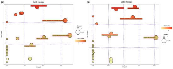 Pathway enrichment analysis of sugar beet roots. (A) Mid storage time point and (B) late storage time point. Data are mean ± standard error of 4 replicates (each replicate consists of samples obtained from two roots).
