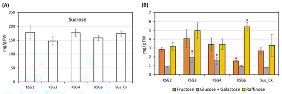 Carbohydrate content in the roots showed small changes between the resistant and susceptible lines at the late storage time point. Cellular contents (mg/g FW) of: (A) sucrose and (B) fructose, glucose and galactose, and raffinose. Data are mean ± standard error of 4 replicates (each replicate consists of samples obtained from two roots); p < 0.05 * between the susceptible (Sus_Ck) and resistant genotypes (KSG2, KSG3, KSG4, and KSG6).