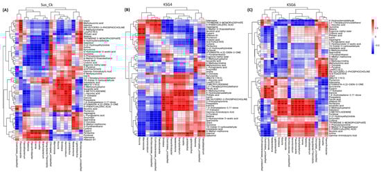 Correlation analysis between the root microbiome and metabolome at the late storage time point reveals a distinct pattern in the two highly resistant genotypes vs. the susceptible genotype. (A) Susceptible genotype (Sus_Ck); (B) resistant genotype, KSG4; and (C) resistant genotype, KSG6. Data are mean ± standard error of 4 replicates (each replicate consists of samples obtained from two roots). An ‘X’ sign inside the rectangular boxes in the heatmap indicates p < 0.05.
