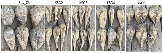 Disease symptoms on sugar beet roots at the late storage time point under indoor storage conditions. Representative samples showing surface coverage with fungal growth in the susceptible genotype (Sus_Ck) and resistant genotypes (KSG2, KSG3, KSG4, and KSG6).