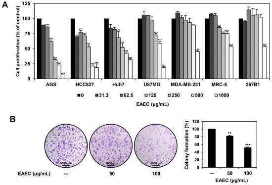 Effects of EAEC on the proliferation of various cancer and normal cell lines. (A) AGS, HCC827, Huh7, U87MG, MDA-MB-231, MRC-5, and 267B1 cells were exposed to increasing concentrations of EAEC (0–1000 μg/mL) for 72 h, and cell proliferation was assessed using the MTT assay. (B) AGS cells were exposed to EAEC (50, 100 μg/mL) and incubated for 6 days. Cell colonies were then stained with crystal violet. ** p < 0.01, *** p < 0.001 compared to control.