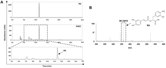 E. amoenum is a medicinal herb that contains several bioactive substances []. To identify the primary active ingredients of EAEC, high-performance liquid chromatography (HPLC) and liquid chromatography–mass spectrometry (LC-MS) analyses were performed. RA was identified at a retention time of 11.30 min, with a wavelength of 254 nm in the HPLC analysis of EAEC (Figure 2A). The concentration of RA, determined by HPLC, was 0.031 mg per 1 mg of EAEC. Moreover, RA was identified at a mass of 361.0915 m/z in the LC-MS analysis of EAEC (Figure 2B). These results confirm that RA is the principal active ingredient in EAEC.