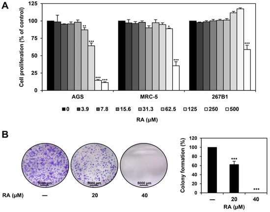 Effect of RA on the proliferation of AGS cells. (A) AGS, MRC-5, and 267B1 cells were exposed to increasing concentrations of RA (0–500 μM) for 72 h, and cell proliferation was assessed using the MTT assay. (B) AGS cells were exposed to RA (20, 40 μM) and incubated for 6 days. Cell colonies were then stained with crystal violet. * p < 0.05, ** p < 0.01, *** p < 0.001 compared to control.