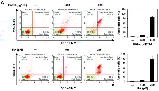 To assess the effect of EAEC and RA on apoptosis, AGS cells were cultured in 60 mm culture dishes and then exposed to EAEC (400, 800 μg/mL) or RA (100, 200 μM) for 24 h. Afterward, the cells were collected, labeled using Muse® Annexin V & Dead Cell reagent (Luminex, Austin, TX, USA), and kept in the dark at room temperature. Apoptosis was evaluated with the Muse® Cell Analyzer using MuseSoft_V1.8.0.3 (Luminex, Austin, TX, USA) [].