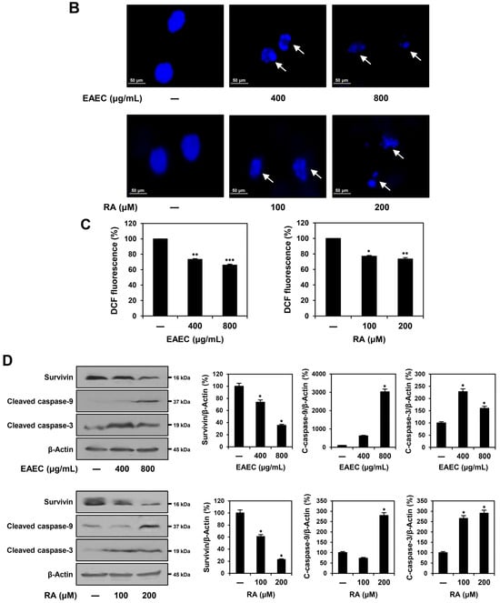 To investigate whether EAEC and RA inhibit cell proliferation by inducing apoptosis, AGS cells were labeled with Muse® Annexin V & Dead Cell reagent and evaluated using flow cytometry. As shown in Figure 4A, compared with that in the AGS control group, treatment with EAEC (400, 800 μg/mL) increased early apoptosis to 0.60% of the total cells, while late apoptosis increased to 84.70% at higher concentration. Compared with the control group, the RA (100, 200 μM) treatment group showed an increase in early apoptosis to 1.05% and to 96.40% in late apoptosis at a higher concentration. To further investigate whether EAEC and RA have the potential to alter nuclear morphology, 4′,6-diamidine-2′-phenylindole dihydrochloride (DAPI) staining was performed. As illustrated in Figure 4B, treatment with EAEC (400, 800 μg/mL) and RA (100, 200 μM) notably induced nuclear fragmentation. Next, a ROS assay was performed using the fluorogenic indicator dichlorodihydrofluorescein diacetate (DCFH-DA). However, as shown in Figure 4C, treatment with EAEC and RA reduced ROS generation in AGS cells. Other studies have also reported the antioxidant activities of E. amoenum and RA [,]. Thus, the reduction in ROS levels in AGS cells may be related to their antioxidant effects. To further evaluate whether EAEC and RA regulate apoptosis in AGS cells, the levels of survivin and cleaved forms of caspase-9 and caspase-3 were examined. Survivin, an inhibitor of the apoptosis protein family, prevents apoptosis by inhibiting the activation of caspases []. Activated caspase-9 serves as the initiator protease in the intrinsic apoptotic pathway, cleaving and activating caspase-3 to execute cellular apoptosis []. Treatment with EAEC (400, 800 μg/mL) and RA (100, 200 μM) reduced the expression of survivin and increased that of cleaved caspase-9 and cleaved caspase-3 (Figure 4D). These findings indicate that the antiproliferative effects of EAEC and RA on AGS cells are linked to the induction of apoptosis.