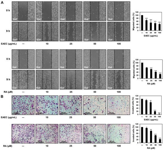 To confirm the abilities of EAEC and RA to suppress the migration ability of AGS cells, a wound-healing assay was conducted. Wound closure was detected after 9 h of treatment and compared with that in the untreated control. Treatment with EAEC (10, 25, 50, 100 μg/mL) and RA (10, 25, 50, 100 μM) notably suppressed the migration of AGS cells (Figure 5A). To further confirm the anti-metastatic effects of EAEC and RA on AGS cells, an invasion assay was conducted using a Transwell chamber system coated with extracellular matrix (ECM) gel. Treatment with EAEC (10, 25, 50, 100 μg/mL) and RA (10, 25, 50, 100 μM) markedly inhibited the invasiveness of AGS cells after 9 h of treatment (Figure 5B). These results indicate that EAEC and RA can effectively suppress AGS cell metastasis.