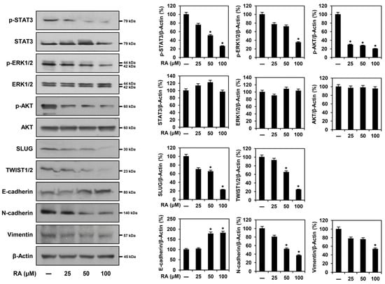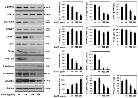 To assess whether EAEC and RA affect the expression of metastasis-related markers in AGS cells, a Western blot analysis was conducted. As depicted in Figure 6, treatment with EAEC (50, 100, 200 μg/mL) and RA (25, 50, 100 μM) led to a dose-dependent increase in E-cadherin expression and a reduction in N-cadherin and vimentin levels in AGS cells. Treatment with EAEC and RA further lowered the expression levels of upstream markers, including SLUG and TWIST1/2. Moreover, they significantly suppressed the expression of the phosphorylated forms of signaling pathway markers, including STAT3, ERK1/2, and AKT. Overall, EAEC and RA suppressed the metastatic ability of AGS cells by modulating the expression of transcription factors and markers related to EMT through suppression of the STAT3/ERK1/2/AKT signaling cascade.