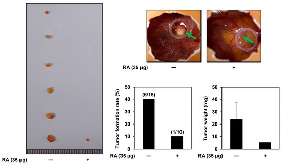Effects of RA on the in vivo tumor growth in AGS cells, examined using the CAM assay. AGS cells were combined with ECM gel, either with or without RA (35 μg per egg), and injected onto the CAM surface of fertilized chick eggs. After 10 days of incubation, the tumors (green arrows) were excised, and both the tumor formation rate and weight were measured.