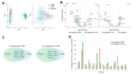 Principal component analysis (PCA) of OR gene expression in TCGA GBM (IDH wildtype), TCGA lower grade glioma (LGG, IDH mutant), and Genotype-Tissue Expression (GTEx) cerebral cortex samples revealed distinct clustering patterns, demonstrating unique OR expression patterns in GBM compared to LGG and normal brain tissues (Figure 1A). To better understand the relationship between PCA clusters and OR expression patterns, we performed differential expression gene (DEG) analysis. The analysis revealed that the GBM-specific cluster was characterized by 46 up-regulated and 92 down-regulated ORs compared to normal brain tissue (Table S1). When compared to LGG samples, this cluster showed elevated expression of 10 ORs and decreased expression of 12 ORs. Notably, among these dysregulated ORs, eight up-regulated and seven down-regulated ORs maintained their expression patterns in both comparisons (versus normal brain and LGG), suggesting their potential involvement in GBM-specific processes (Figure 1B,C, Table S1). Visualization of OR expression levels on the PCA plot confirmed that these top up-regulated ORs showed enriched expression specifically in the GBM cluster (Figure S1). Interestingly, several of these up-regulated ORs have been previously reported in other cancers. For instance, OR2B6 overexpression has been reported in breast cancer, and OR51E1 has been found to be elevated in advanced prostate cancer and other solid tumors, consistent with our findings [,,,,]. The persistent dysregulation of certain ORs, such as OR2B6 and OR51E1, in comparisons with both normal and LGG tissues suggests that these ORs may be involved in critical GBM-specific processes, potentially contributing to malignancy or treatment resistance. Analysis of OR family distribution revealed that OR family 7 was the most enriched (21%) in up-regulated ORs, while OR family 2 comprised the largest portion (28%) of down-regulated ORs (Figure 1D). Interestingly, a significant proportion of dysregulated ORs were pseudogenes, with 32% of up-regulated and 52% of down-regulated ORs in this category, indicating that both functional OR genes and pseudogenes may contribute to GBM pathogenesis and its microenvironment (Table S1).
