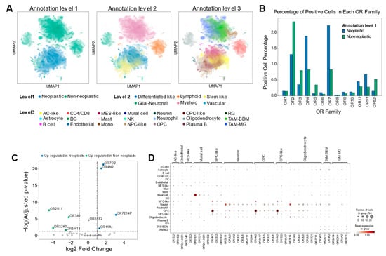 Cell-type-specific OR expression patterns in GBM at single-cell resolution. (A) Uniform manifold approximation and projection (UMAP) visualization of scRNA-seq data showing the distribution of cell populations in GBM. Each cell (dot) is colored by cell identity at three annotation levels (left: level 1, middle: level 2, right: level 3), following the reference publication annotation scheme []. (B) OR family distribution analysis showing the percentage of OR-positive cells across cell populations, demonstrating predominant enrichment of OR family 7 in neoplastic cells and OR family 2 in non-neoplastic cells. Cells with positive expression of any OR in each OR family were designated as OR-positive. (C) Differential expression analysis of OR genes between neoplastic and non-neoplastic cells. Colored dots represent differently expressed ORs (|log2 fold change| > 1, adjusted p-value < 0.05). (D) Cell-type-specific differentially expressed OR genes based on annotation level 3 (adjusted p-value < 0.05). Statistical significance was assessed by Wilcoxon rank-sum testing with Benjamini–Hochberg correction.