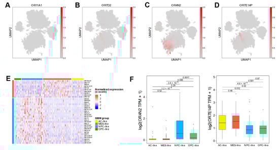 To examine the heterogeneity of OR expression within tumor cells, we analyzed OR expression patterns across four distinct GBM neoplastic cell states. Among the neoplastic-up-regulated OR genes, OR11A1 showed uniformly weak expression, while OR7D2 exhibited significant expression across all malignant states (Figure 3A,B, Table S2). In contrast, OR4N2 and OR7E14P demonstrated state-specific patterns, with predominantly enriched in neural precursor cell (NPC)/oligodendrocyte precursor cell (OPC)-like and mesenchymal (MES)-like states, respectively (Figure 3C,D). These findings highlighted the distinct regulation of ORs in different GBM cellular states. Despite minor discrepancies due to cellular plasticity and intra-tumoral heterogeneity, where multiple malignant states coexist within bulk tissue samples [], validation using TCGA GBM bulk tissue data corroborated these patterns. OR4N2 exhibited significantly higher expression in tumors with NPC-like features, while OR7E14P showed elevated expression in tumors with MES-like characteristics compared to other tumors (Figure 3E,F).
