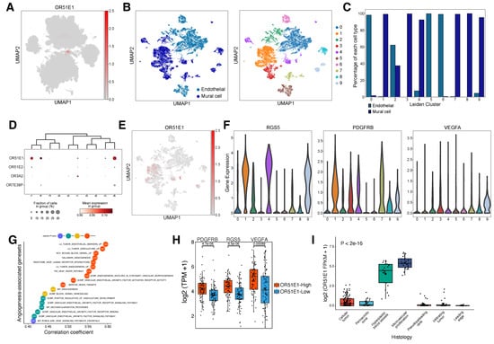 Cell-type-specific OR expression analysis identified vascular-associated OR genes, including OR51E1, in endothelial cells and pericytes (mural cells) (Figure 2D and Figure 4A). Sub-clustering analysis of vascular cells using scRNA-seq data revealed 10 distinct clusters (Figure 4B), with clear separation between mural and endothelial cell populations (Figure 4C). Clusters 0, 5, and 6 were enriched for endothelial cells, while clusters 1, 3, 4, 7, 8, and 9 were dominated by mural cells, with cluster 2 showing mixed populations. Among vascular-associated ORs, OR51E1, OR51E2, OR3A2, and OR7E38P demonstrated cluster-specific expression patterns (Figure 4D,E, Table S3). Notably, OR51E1 exhibited prominent expression in clusters 1, 4, and 9, which were characterized by elevated levels of pericyte markers RGS5 and PDGFRB (Figure 4F). VEGFA, a key regulator of vascular remodeling and angiogenesis [], was predominantly expressed in GBM neoplastic cells rather than vascular cells (Figure S5), suggesting potential paracrine signaling between VEGFA-secreting tumor cells and OR51E1-positive pericytes. Analysis of the TCGA GBM dataset revealed OR51E1’s strong correlations with vascular cell populations as well; correlation analysis with cell type-specific gene sets demonstrated significant positive associations with both mural (r = 0.63) and endothelial cells (r = 0.4), with mural cells showing stronger correlation (Figure S6). Consistently, OR51E1 expression showed significant positive correlations with gene sets of blood vessel remodeling and angiogenesis (Figure 4G). Furthermore, OR51E1-high GBM tissues showed significantly elevated expression of RGS5, PDGFRB, and VEGFA compared to OR51E1-low samples (Figure 4H). The anatomical analysis using the Ivy Glioblastoma Atlas dataset further substantiated these findings, demonstrating significant OR51E1 up-regulation in regions of microvascular proliferation and hyperplastic blood vessels (Figure 4I). Taken together, these results suggest that OR51E1 plays a crucial role in GBM vasculature, particularly in pericyte-mediated vascular remodeling and tumor angiogenesis, potentially influencing tumor progression and therapeutic resistance.