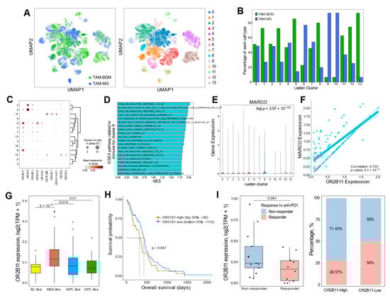 We identified OR2B11, OR3A2, and OR52K1 as GBM TME-specific genes with enriched expression in TAMs (Figure 1 and Figure 2). To understand their roles in TAM populations, including bone marrow-derived macrophages (TAM-BDM) and microglia (TAM-MG), we performed sub-clustering analysis using scRNA-seq data, revealing 14 distinct clusters (Figure 5A). The TAM sub-clusters showed heterogeneous distribution of TAM-BDM and TAM-MG populations, with distinct OR expression patterns (Figure 5B,C, Table S4). Among these OR genes, OR2B11 showed robust positive correlation with both TAM-BDM and TAM-MG in TCGA GBM tissues, consistent with scRNA-seq analysis (Figures S2A and S7). Notably, cluster 8, enriched in TAM-BDM and characterized by elevated NF-κB and TGF-β signaling, showed exclusive OR2B11 expression among OR genes (Figure 5C and D). These pathways are key regulators of mesenchymal transition in GBM [,,]. Previous studies have demonstrated that MARCO-high TAMs promote immunosuppressive TME and aggressive tumor phenotypes by enhancing radiation resistance, stemness, and mesenchymal transition [,]. MARCO was up-regulated in cluster 8, and OR2B11 showed significant positive correlation with MARCO expression in this cluster (Figure 5E,F). Consistently, OR2B11 exhibited significantly higher expression in the mesenchymal subtype compared to other subtypes (Figure 5G). Although the statistical significance was modest, OR2B11 expression tended to be associated with poor survival (p = 0.087) and reduced response to anti-PD1 immunotherapy (p = 0.081) (Figure 5H,I). Collectively, these results suggest that OR2B11 may serve as a potential therapeutic target for GBM by promoting mesenchymal transition and immunosuppressive TME through TAM regulation, potentially driving aggressive tumor behavior.