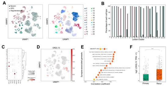 OR2L13 was identified as a significantly down-regulated OR gene in GBM compared to normal and LGG tissues (Figure 1B and Table S1), with cell-type-specific expression analysis revealing its predominant expression in oligodendrocytes and neurons rather than tumor cells (Figure 2D, Figures S1B and S8). To further characterize its expression pattern, we performed sub-clustering analysis of neurons, oligodendrocytes, and OPCs using scRNA-seq data (Figure 6A). OR2L13 was primarily expressed in clusters enriched for oligodendrocytes and neurons, with minimal expression in OPCs (Figure 6B–D, Table S5). Oligodendrocytes and neurons orchestrate synapse activation through myelination-dependent regulation of action potential propagation and neurotransmitter release at synaptic junctions []. Notably, a recent study demonstrated that recurrent GBMs after treatment exhibited enhanced synaptic activity compared to their pre-treatment counterparts []. Analysis of the TCGA GBM dataset revealed significant positive correlations between OR2L13 expression and synapse-associated gene sets (Figure 6E). Consistently, OR2L13 showed significant up-regulation in recurrent tumors in the Glioma Longitudinal AnalySiS (GLASS) dataset (Figure 6F). These findings suggest that OR2L13 may play a role in treatment-driven neuronal adaptation within GBM, potentially influencing synaptic pathways that support tumor recurrence and therapy resistance.