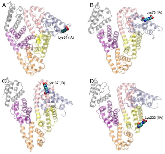 Three-dimensional structures of glycated human serum albumin (gHSA) modified at Lys64 (A), Lys73 (B), Lys137 (C), Lys233 (D), Lys262 (E), Lys317 (F), Lys378 (G), Lys525 (H), Lys573 (I) and Lys574 (J) obtained by molecular modeling. Glycated lysines are represented by colored spheres. The carbon, oxygen, and nitrogen atoms of glycated lysines are shown in cyan, red, and blue, respectively. Domains IA, IB, IIA, IIB, IIIA, and IIIB of gHSA are shown with ice blue, pink, yellow, orange, purple, and black ribbon, respectively. After the glycated lysine number, the gHSA domain to which it belongs is indicated in parentheses.