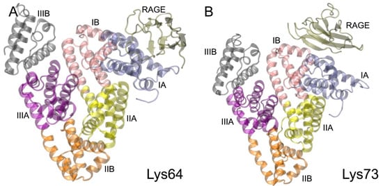 As for the RMSF, RAGE’s interaction with glycated Lys137 and Lys573 causes the greatest fluctuation in the HSA amino acids (Figure S6C,I), with the maximum expectedly occurring in domains IB and IIIB. This effect is slightly less pronounced in the RAGE complexes with glycated Lys64 and Lys73 (Figure S6A,B). For the remaining lysines, the fluctuations are even less pronounced (Figure S6D–J). In general, comparing the structural changes in the gHSA molecule after glycation (Figures S1–S3) and after RAGE binding (Figures S4–S6), one can conclude that it is glycation itself, and not the interaction with RAGE, that has a greater effect on the characteristics of gHSA.