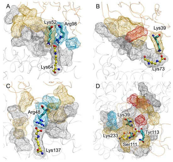 Interaction of RAGE with gHSA glycated at Lys64 (A), Lys73 (B), Lys137 (C), Lys233 (D), Lys262 (E), Lys317 (F), Lys378 (G), Lys525 (H), Lys573 (I) and Lys574 (J) according to MD simulation. The backbones of the HSA and the V-domain of RAGE are shown as the gray and orange threads, respectively. The regions of gHSA contacting with RAGE are shown as a gray surface. The regions of RAGE contacting with gHSA are shown with red (IS1), blue (IS2), green (IS3) or brown (none of the IS) surfaces. Carbon, hydrogen, oxygen and nitrogen atoms of amino acids are shown in cyan, white, red and blue, respectively. The glycated lysines of gHSA are shown in the “ball and sticks” representation; their carbon atoms are highlighted in yellow. The residues of RAGE that are involved in the interaction with CML of gHSA are shown in the “sticks” representation. Nonessential hydrogens are not shown for clarity. For clarity, the projections of the images presented in this figure do not always correspond to the projections in Figure 4, Figure 5 and Figure 6.