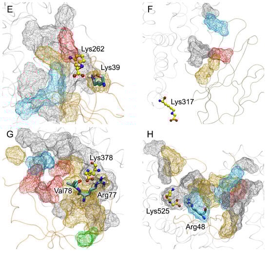 In the cases of the glycation of Lys137 and Lys574, as expected, the gHSA molecule is characterized by an increase in the SASA value (Figure S5C,J). A similar effect, although to a lesser extent, occurs in the RAGE complex with gHSA glycated at Lys573 (Figure S5I), in which the V-domain also interacts with domains IB and IIIB of gHSA (Figure 6I). This is also likely due to the movement of domains IB and IIIB relative to each other. It is also interesting to note the increase in the SASA in the case of glycated Lys378 (Figure S5G). We believe this may be due to the fact that in this complex RAGE interacts with some amino acids of domain IIIA (namely, Gln385, Pro441, Glu442, Met446, Table 3), which can affect the conformation of domain IIIB (its susceptibility to external influences has been already mentioned in this section and in Section 2.2). For other lysines, the interaction of gHSA with RAGE does not significantly change the value of albumin’s SASA (Figure S5A,B,D–F,H).