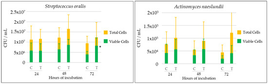 Kinetics (expressed as mean and standard deviation (SD)) of total and live microbial species (colony-forming units (CFUs)/mL) determined by quantitative polymerase chain reaction (qPCR) in 24, 48, and 72 h biofilms on dental implants in the presence (T, test) and absence (C, control) of Candida albicans (n = 9), using specific primers and probes directed to the 16S rRNA gene. * p < 0.05, statistically significant differences when comparing CFU/mL between test and control biofilms at each time interval. Comparisons between groups were performed considering viable cells and total cells. Figure corresponding to Supplementary Table S1.