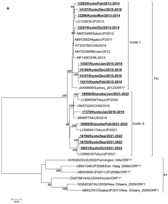 To gain insights into the evolutionary trend of globally dominating NoV strains, 14 NoV GII.P31/GII.4_Sydney_2012-positive stool samples were selected, of which 12 were collected from a single pediatric outpatient clinic in Kyoto prefecture between 2012 and 2022, while the remaining 2 were collected from Shizuoka prefecture in 2022. Full-length genome sequences (~7500 nt) were obtained from all 14 samples, of which 13 remained outbreak strains (Table 1). An outbreak strain was chosen if several children (eight or more) in the clinic were found to be sick with NoV GII.P31/GII.4_Sydney_2012 at the same time. Notably, outbreak strains used in this study were primarily selected from three major outbreaks in Kyoto, each of which lasted for several months. To comprehend the genetic alterations during a single epidemic, several samples from both nearby and distant samples were chosen from each epidemic. The children were aged from 7 to 40 months. Co-infections were detected in four children with classic Astrovirus 1 (AstV1) in both Kyoto and Shizuoka in 2021–2022.