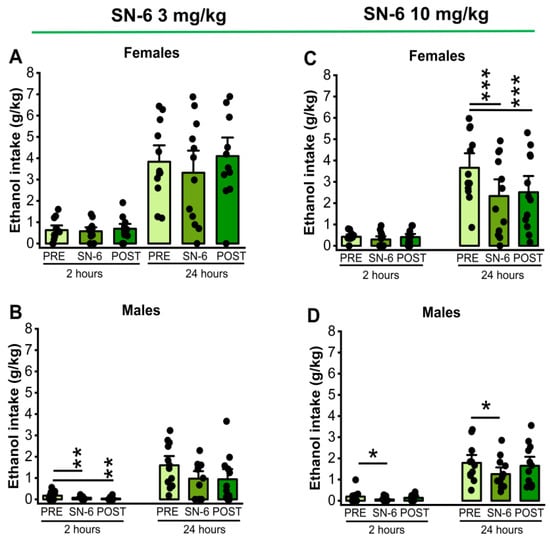 SN-6 and ethanol intake. SN-6 (3 or 10 mg/kg) was orally administered 30 min before exposure to water and 7.5% ethanol. At a dose of 3 mg/kg (p.o.), SN-6 significantly reduced ethanol intake in male (panel (B)) but not female (panel (A)) rats 2 h after exposure to water and 7.5% ethanol. Additionally, at a dose of 10 mg/kg (p.o.), SN-6 significantly reduced ethanol intake in both male and female rats; notably, the effect was more prominent in females and lasted longer (panels (C,D)). The filled dots represent individual data points. The data are presented as mean ± S.E.M for alcohol intake, and the analysis was performed using one-way repeated measures ANOVA followed by Bonferroni post hoc correction (* p < 0.05, ** p < 0.01 and *** p < 0.001, n = 12).