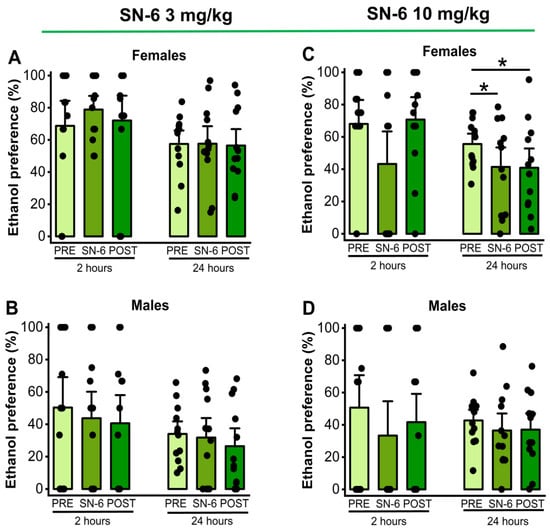 SN-6 and ethanol preference. SN-6 (3 or 10 mg/kg) was orally administered 30 min before exposure to water and 7.5% ethanol. When administered at 3 mg/kg (p.o.), SN-6 did not affect ethanol preference in either male or female rats (panels (A,B)). However, SN-6 at 10 mg/kg (p.o.) significantly decreased ethanol preference in female rats but not in male rats 24 h after exposure to water and 7.5% ethanol (panels (C,D)). The filled dots represent individual data points. The data are presented as percentages (%) and were analyzed using one-way repeated measures ANOVA followed by Bonferroni post hoc correction (* p <0.05, n = 12).
